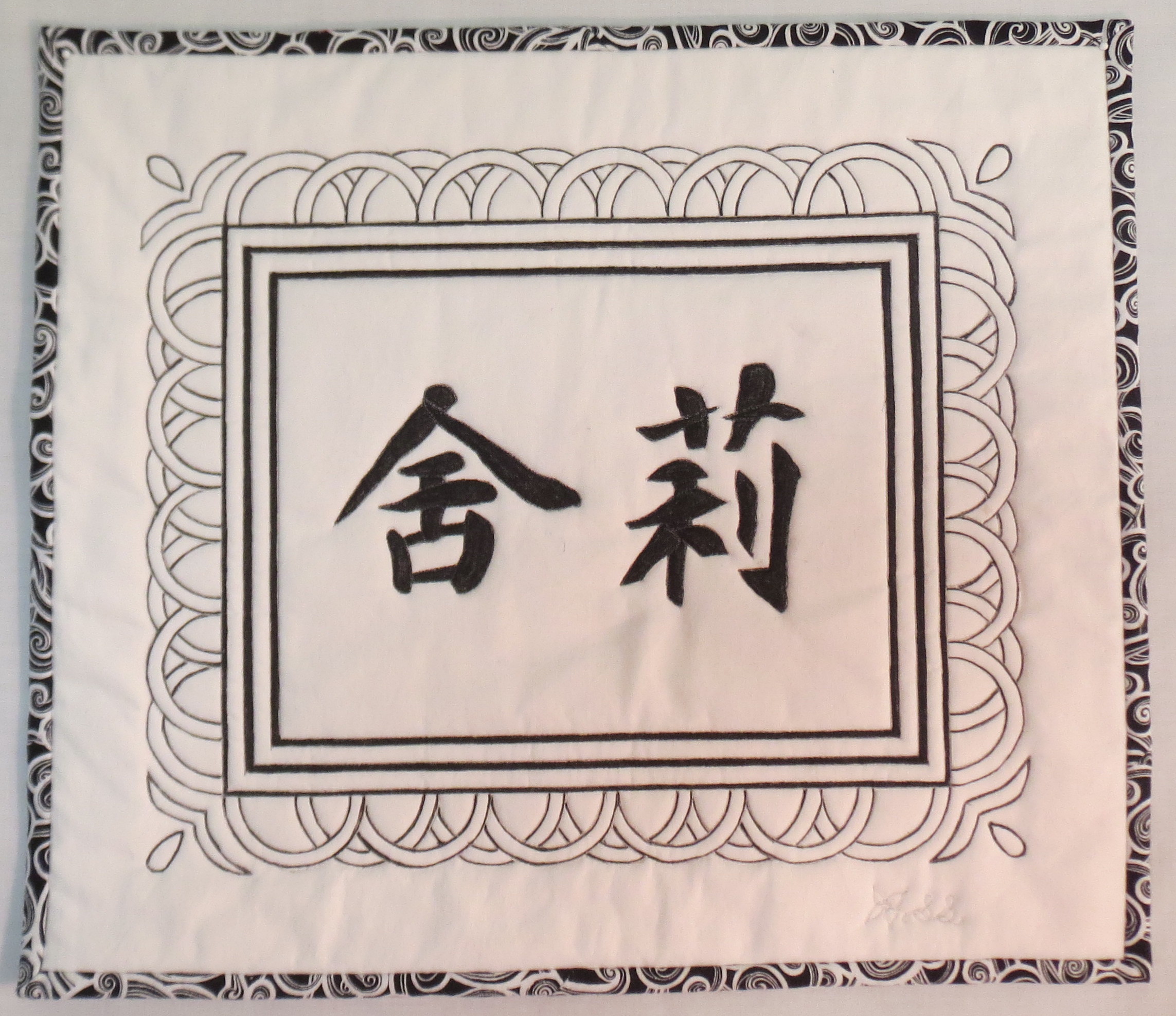 Although this came out OK, I think I would prefer it done more traditionally – using a heavy black thread and/or satin stitching for the lines, and with the characters done in regular applique. There is a flatness to the ink that doesn’t appeal to me for this formal a design. Interesting, since I don’t have the same reaction to the zentangle form, which I like a lot.