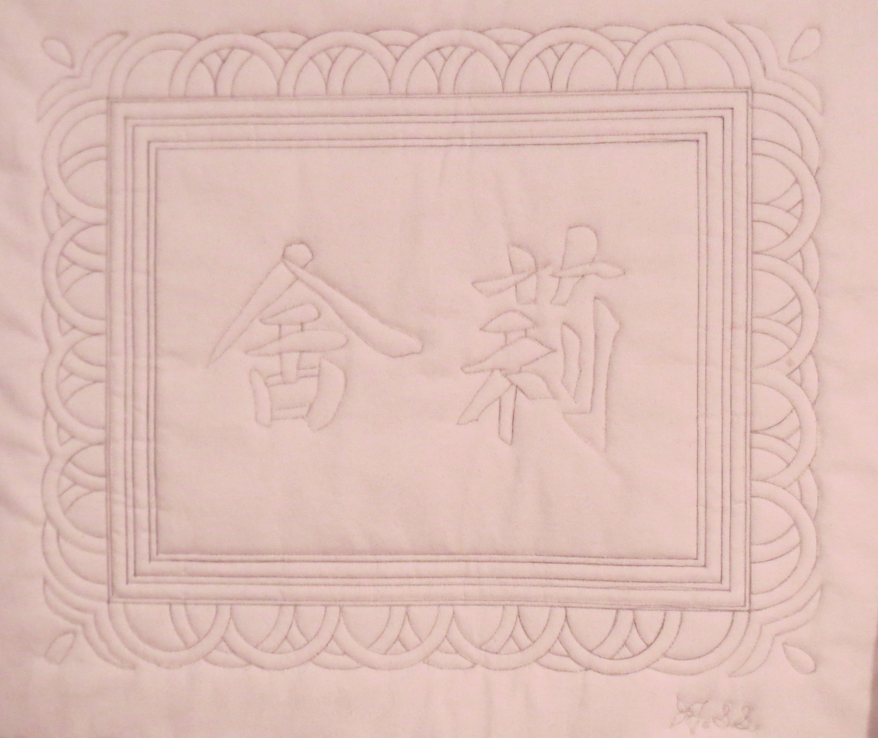 I designed a small quilt in black and white (the central chinese characters came from a book on Chinese calligraphy and are supposed to represent “Shirley”) . Following Sherry’s directions, I used a high thread count fabric (Pimatex) and pre treated it by spraying with Scotchgard and an art fixative. After letting the fabric dry – it was quite stiff – I drew the design on the fabric with a pencil. I sandwiched the quilt and stitched on the drawn lines with a fine white thread. I did some free motion but a lot of the stitching was done with a walking foot, since I knew the straight lines would come out straighter that way. Then I used a Gelly Roll pen to draw on top of the quilting threads, and used Pigma pens to fill in the large black areas. You can see the quilted but not inked version below with the inked version underneath.