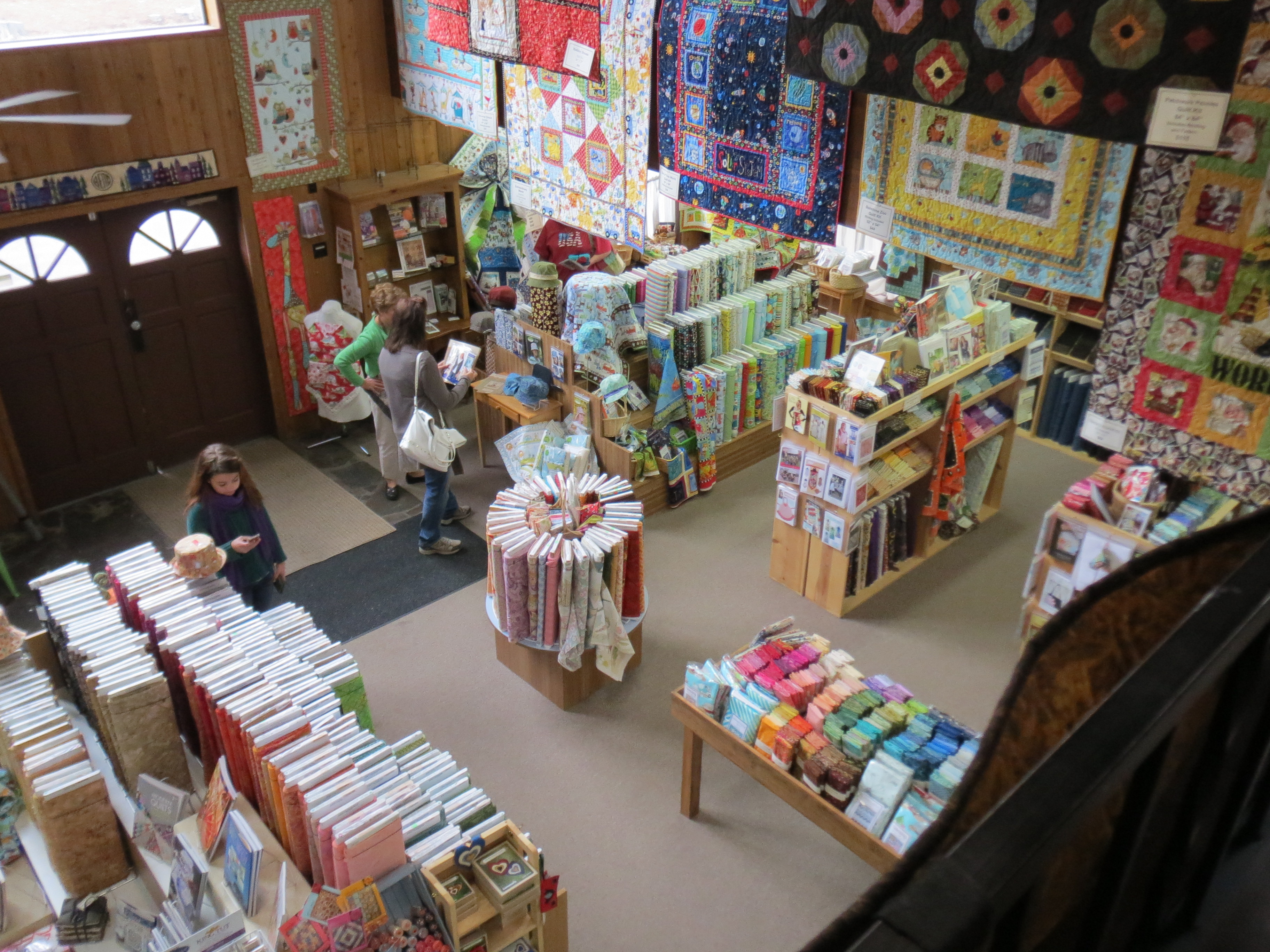 I was in Central Oregon this past weekend for a high school reunion and visited a couple of quilt shops in Bend.  They are great shops and well worth visiting if you are in the area.  The first shop I saw was Quiltworks (www.quiltworks.com), a lovely shop with a great mezzanine where they have changing quilt exhibits.  The photo below was taken looking down at the shop from the mezzanine.