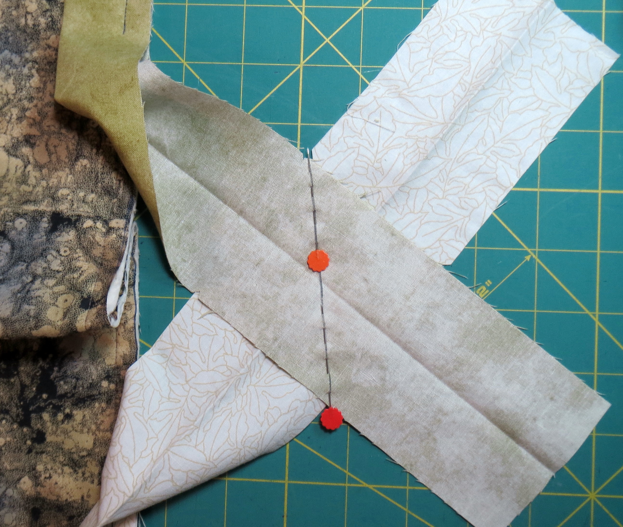 Place one pin on the marked diagonal on each side of the binding center fold.  Keep these pins clear of the binding fold.  Remove any pins in the binding that are not along the marked sewing line.