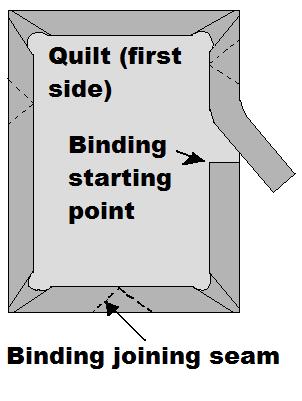1. Step  One.  When you attach the binding, leave a 12 inch unstitched tail at the beginning, as shown in the photo and drawing below.  NOTE:  (first side) in the drawings means the quilt side you attach the binding to first – usually the quilt top, but for machine applied  bindings some quilters attach to the quilt back first.