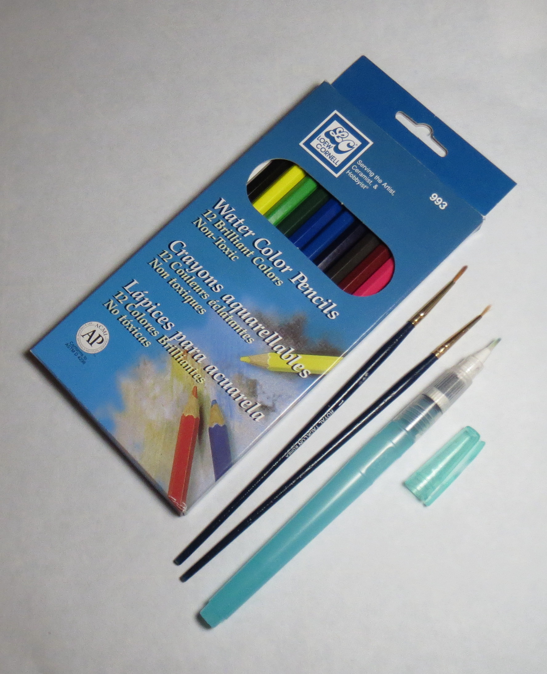 First, the tools.  You need some watercolor pencils – I only own a set of 12, so my color palette is quite limited.  Next you need heavy drawing paper (watercolor paper if you have it), some water, clean paper towels for blotting up the water, and a small paint brush or two.  A good art eraser and a pencil sharpener would also be helpful.  In addition to the small brushes, I added a brush with a built in water reservoir that I purchased when I got the watercolor pencils.  It is really cool  — you just squeeze the tube and water comes out in the brush.  Good for working in large areas, but not as precise as a brush that you dip in water.  Here is a photo of the pencils and brushes: