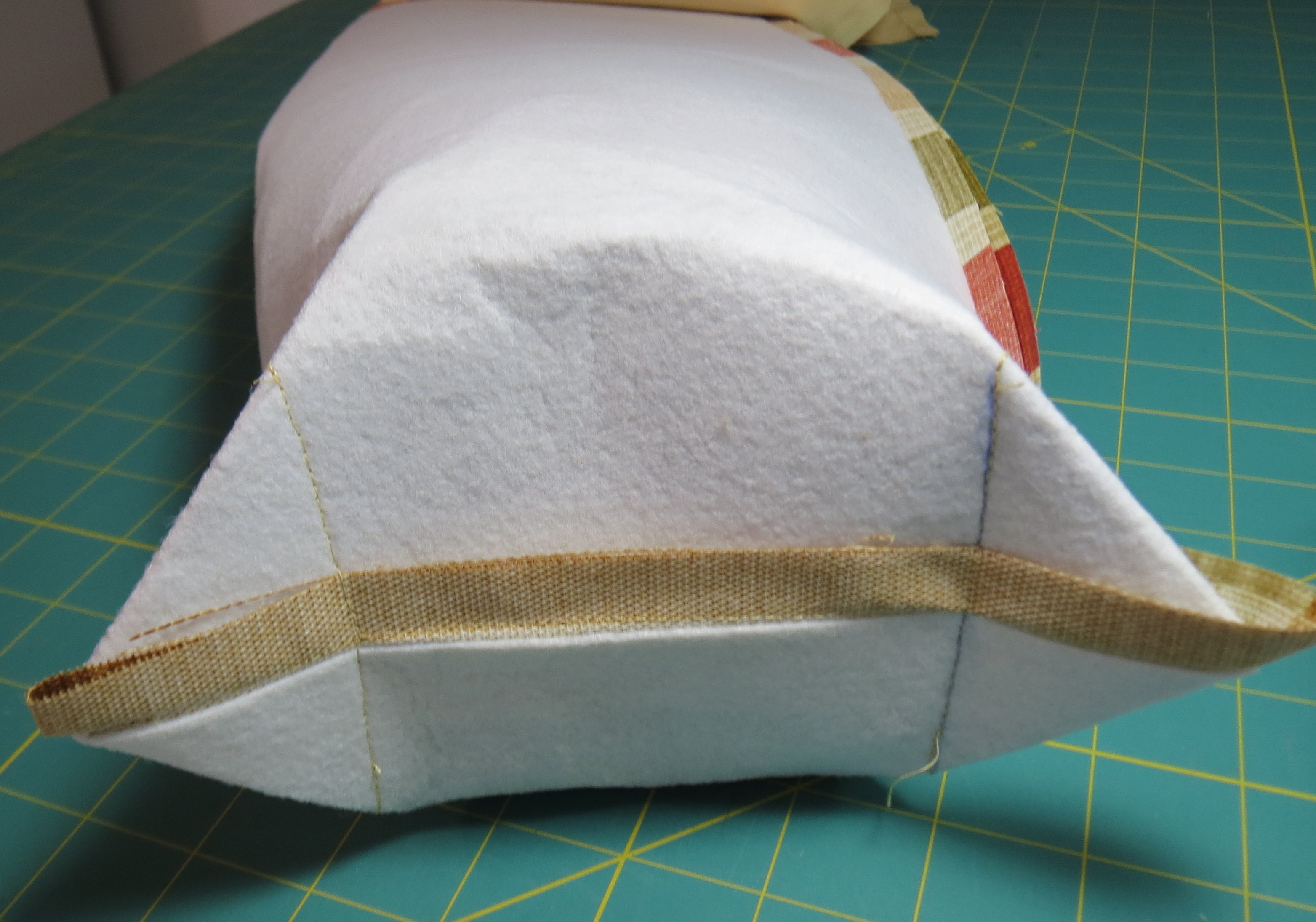 Open the bottom out and sew across to make a couple of “ears” as shown below. The seam to make each ear will be about 3 inches long, so the bag will be roughly circular at the bottom.