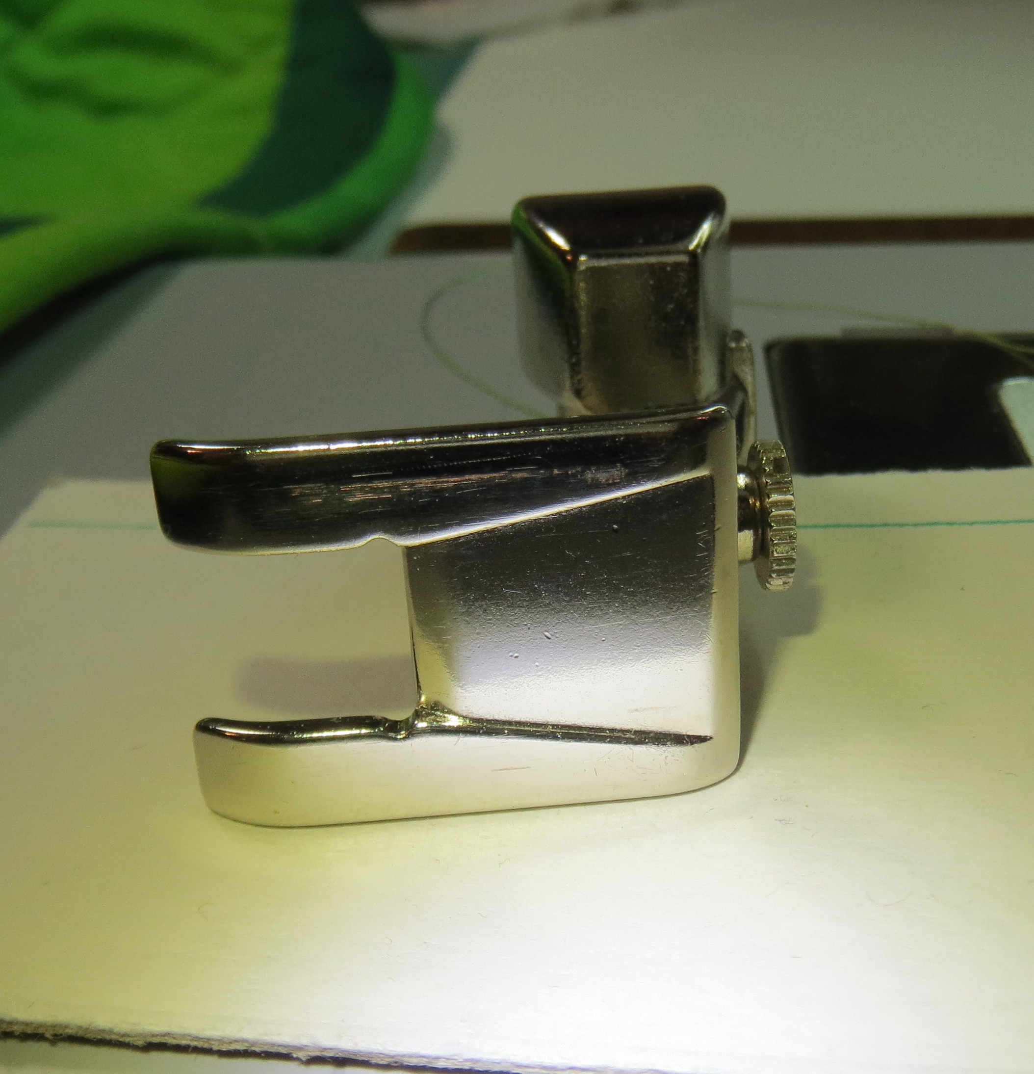 For these decorative stitches, another presser foot must be used. The best foot to select is an open-toed satin stitch or embroidery foot, such as the one shown below. The photograph shows a Bernina foot for my machine that has a 9 mm stitch width; if your machine has a narrower stitch width, your foot will also be narrower. The embroidery foot can be distinguished from other feet by the groove on the bottom, shown in the right hand photo. The groove allows a dense stitch that stands above the fabric to move under the foot smoothly.